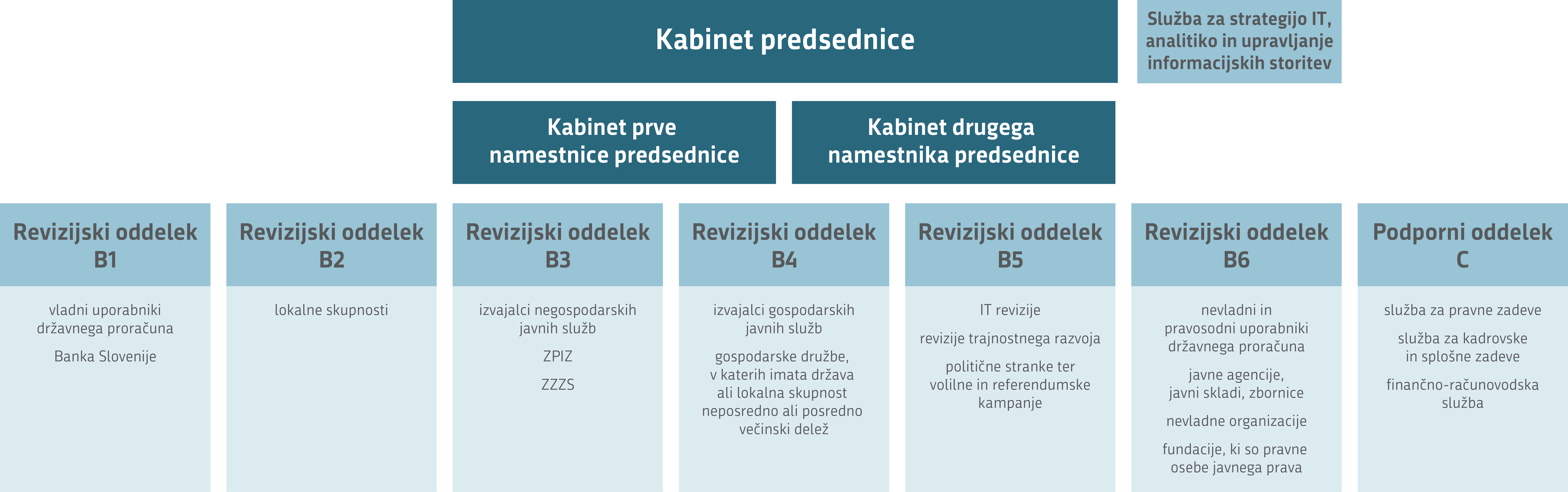 Računsko sodišče ima poleg članov še največ šest vrhovnih državnih revizorjev, ki vodijo revizijske oddelke, in sekretarja računskega sodišča, ki vodi podporni oddelek. Vsi imajo status funkcionarja, imenuje pa jih predsednik računskega sodišča za dobo devetih let. Člani, vrhovni državni revizorji in sekretar računskega sodišča lahko za iste funkcije kandidirajo večkrat brez omejitve. Računsko sodišče zastopa, predstavlja in vodi predsednik računskega sodišča, ki ima hkrati tudi funkcijo generalnega državnega revizorja.